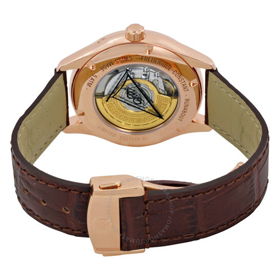 علبة من الفولاذ المقاوم للصدأ بلون الذهب الوردي مع حزام من الجلد البني. إطار ثابت من الفولاذ المقاوم للصدأ بلون الذهب الوردي. ميناء فضي مع عقارب على شكل حرف ألفا بلون الذهب الوردي ومؤشرات ساعات رقمية عربية. علامات دقائق حول الحافة الخارجية. نوع الميناء: تناظري. عقارب مضيئة. تقويم كامل. أربعة أقراص فرعية تعرض: التاريخ، يوم الأسبوع، الشهر، ومرحلة القمر. حركة أوتوماتيكية من عيار فريدريك كونستانت FC-365، تحتوي على 25 جوهرة، تنبض بسرعة 28800 ذبذبة في الساعة، ولديها احتياطي طاقة لمدة 42 ساعة تقريبًا. كريستال ياقوتي مقاوم للخدش. تاج سحب/دفع. غطاء خلفي شفاف. شكل دائري، حجم العلبة: 40 مم، سمك العلبة: 11.2 مم. طول السوار: 7.5 بوصة. قابلة للطي بمشبك أمان. مقاومة للماء حتى عمق 50 مترًا / 165 قدمًا. الوظائف: تقويم كامل، طور القمر، الشهر، التاريخ، اليوم، الساعة، الدقيقة، الثانية. معلومات إضافية: إصدار محدود من ٢٨٨٨ قطعة. سلسلة ساعات ران أباوت مون فايز. تصميم فاخر. علامة الساعة: صناعة سويسرية. إصدارات متنوعة: FC ٣٦٥RM٥B٤، FC.٣٦٥RM٥B٤، FC٣٦٥RM٥B٤. ساعة فريدريك كونستانت ران أباوت الأوتوماتيكية للرجال FC-٣٦٥RM٥B٤.