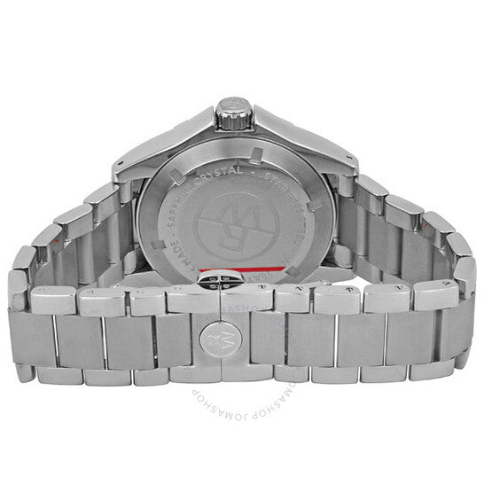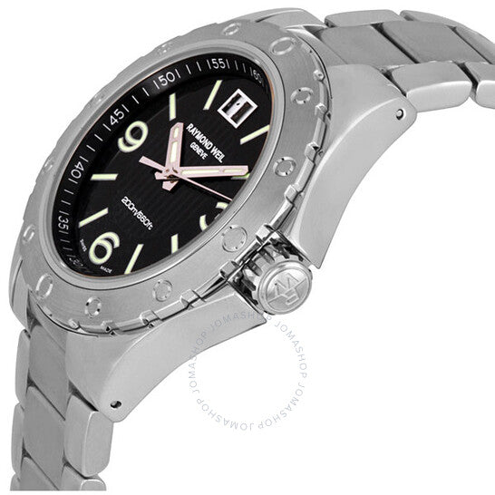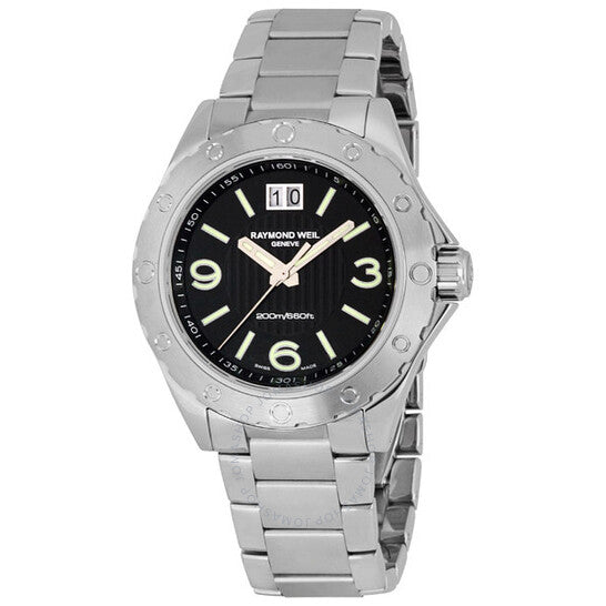 علبة من الفولاذ المقاوم للصدأ مع سوار من الفولاذ المقاوم للصدأ. إطار ثابت من الفولاذ المقاوم للصدأ. ميناء أسود بعقارب مضيئة وعلامات ساعات على شكل عصا. أرقام عربية تُشير إلى الساعات 3 و6 و9. علامات دقائق حول الحافة الخارجية. يعرض التاريخ عند الساعة 12. آلية حركة كوارتز. زجاج ياقوت مقاوم للخدش. تاج لولبي. غطاء خلفي صلب لولبي. قطر العلبة: 44 مم. سُمكها: 12 مم. مشبك قابل للطي. مقاومة للماء حتى عمق 200 متر / 660 قدمًا. الوظائف: الساعات، الدقائق، الثواني، التاريخ. ساعة ريموند ويل RW الرياضية للرجال 8100-ST-05207.
