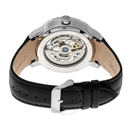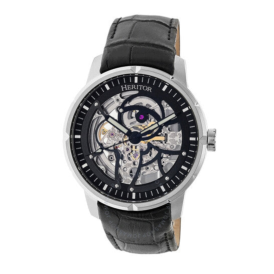 علبة من الفولاذ المقاوم للصدأ مع سوار جلدي أسود (منقوش بنقش جلد التمساح). إطار ثابت من الفولاذ المقاوم للصدأ. ميناء أسود (هيكلي مركزي) بعقارب سوداء مضيئة وعلامات ساعات. علامات دقائق حول الحافة الخارجية. نوع الميناء: تناظري. عقارب مضيئة. حركة أوتوماتيكية باحتياطي طاقة يصل إلى 40 ساعة. كريستال معدني مقاوم للخدش مطلي بالياقوت. تاج قابل للسحب/الدفع. غطاء خلفي شفاف. شكل دائري. حجم العلبة: 44 مم. سمكها: 13 مم. عرض السوار: 22 مم. مشبك تانغ. مقاومة للماء حتى عمق 50 مترًا / 165 قدمًا. الوظائف: الساعات، الدقائق، الثواني. سلسلة رايدر. تصميم كاجوال. ساعة هيريتور رايدر الأوتوماتيكية للرجال بمينا هيكلي HR4602.