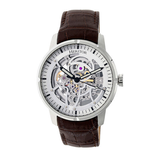 علبة من الفولاذ المقاوم للصدأ مع سوار جلدي بني داكن (منقوش بنقش جلد التمساح). إطار ثابت من الفولاذ المقاوم للصدأ. ميناء هيكلي بعقارب سوداء مضيئة وعلامات ساعات. علامات دقائق حول الحافة الخارجية. نوع الميناء: تناظري. عقارب مضيئة. حركة أوتوماتيكية. كريستال معدني مقاوم للخدش مطلي بالياقوت. تاج قابل للسحب/الدفع. غطاء خلفي شفاف. شكل دائري. حجم العلبة: 44 مم. سمكها: 13 مم. عرض السوار: 22 مم. مشبك تانغ. مقاومة للماء حتى عمق 50 مترًا / 165 قدمًا. الوظائف: الساعات، الدقائق، الثواني. سلسلة رايدر. تصميم ساعة كاجوال. ساعة هيريتور رايدر الأوتوماتيكية للرجال بمينا هيكلي HR4603.