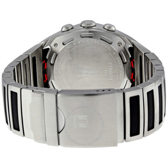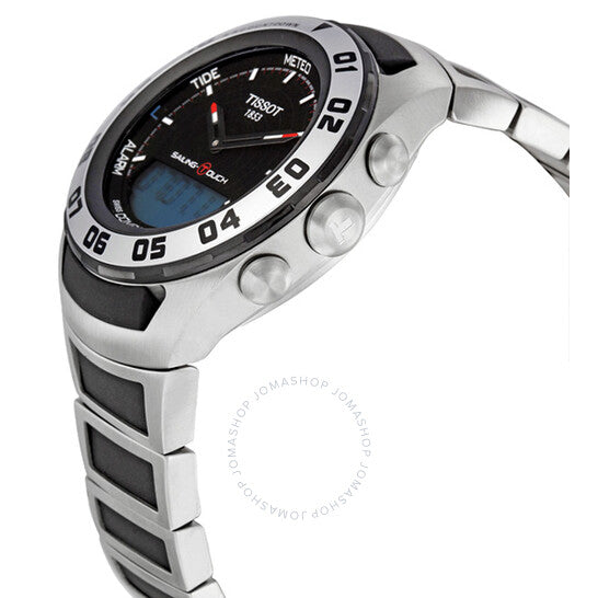 علبة من الفولاذ المقاوم للصدأ مع سوار من الفولاذ المقاوم للصدأ ثنائي اللون (أسود وفضي). إطار ثابت مطلي باللون الأسود مع حلقة علوية فضية. ميناء أسود بعقارب مضيئة وعلامات ساعات. علامات دقائق حول الحافة الخارجية. نوع الميناء: تناظري-رقمي. عقارب وعلامات مضيئة. تقويم دائم. ميناء فرعي رقمي. حركة كوارتز ETA عيار E48.331. زجاج ياقوتي مقاوم للخدش. غطاء خلفي صلب. شكل دائري. حجم العلبة: 45 مم. سمكها: 15 مم. عرض السوار: 23 مم. طول السوار: 8 بوصات. مشبك قابل للطي. مقاومة للماء حتى عمق 100 متر / 330 قدم. الوظائف: تقويم دائم، كرونوغراف، توقيت عالمي، منبه، شهر، تاريخ، يوم، توقيت غرينتش، منطقة زمنية ثانية، ساعة، دقيقة، ثانية، مؤشر عمر البطارية، مقياس حرارة، بارومتر، بوصلة. معلومات إضافية: مترو، ريجيتا، سرعة، بوصلة، منبه، ومد وجزر. ساعة رياضية. علامة الساعة: صناعة سويسرية. إصدارات المنتج: T056 420 21 051 00، T056-420-21-051-00، T056/420/21/051/00، T0564202105100. ساعة تيسوت سيلينج تاتش كرونوغراف للرجال T0564202105100.