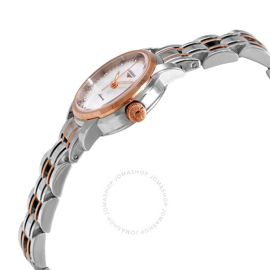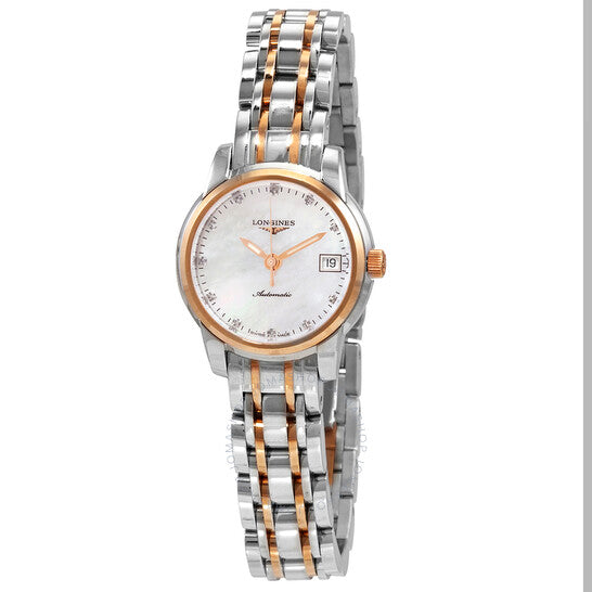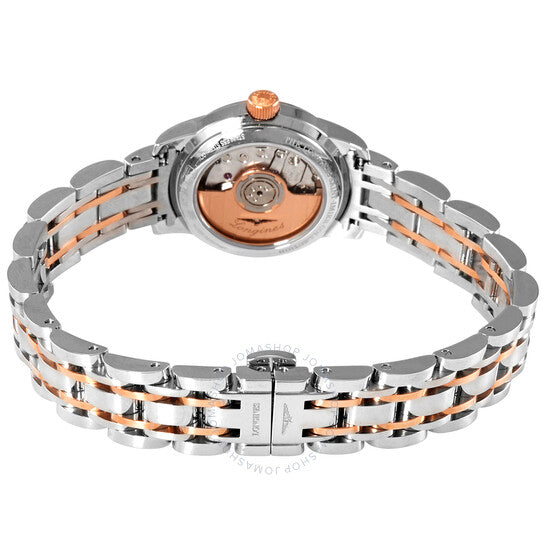 علبة من الفولاذ المقاوم للصدأ مع سوار من الفولاذ المقاوم للصدأ بوصلات من الذهب الوردي عيار 18 قيراطًا. إطار ثابت من الذهب الوردي عيار 18 قيراطًا. ميناء من عرق اللؤلؤ مع عقارب مضيئة بلون الذهب الوردي وعلامات ساعات من الماس. علامات دقائق حول الحافة الخارجية. نوع الميناء: تناظري. عقارب مضيئة. عرض التاريخ عند موضع الساعة 3. حركة لونجين أوتوماتيكية من عيار L595، مبنية على ETA 2000/1، تحتوي على 20 جوهرة، تنبض بمعدل 28800 ذبذبة في الساعة، ولديها احتياطي طاقة لمدة 40 ساعة تقريبًا. زجاج من الياقوت المقاوم للخدش. تاج قابل للسحب/الدفع. غطاء خلفي شفاف. شكل دائري. حجم العلبة: 26 مم. سمكها: 9 مم. مشبك قابل للطي بزر ضغط. مقاومة للماء حتى عمق 30 مترًا / 100 قدم. الوظائف: التاريخ، الساعة، الدقائق، الثواني. سلسلة سانت إيمييه. طراز ساعة رسمية. علامة الساعة: صناعة سويسرية. ساعة لونجين سانت إيمييه أوتوماتيكية مرصعة بالألماس للسيدات L2.263.5.88.7.