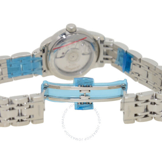 علبة فضية اللون من الفولاذ المقاوم للصدأ مع سوار فضي اللون. إطار ثابت فضي اللون. ميناء أسود بعقارب فضية اللون وأرقام عربية وعلامات ساعات. علامات دقائق حول الحافة الخارجية. نوع الميناء: تناظري. عقارب وعلامات مضيئة. عرض التاريخ عند موضع الساعة 3. حركة أوتوماتيكية من لونجين كاليبر L595 مع احتياطي طاقة لمدة 40 ساعة. زجاج ياقوت مقاوم للخدش. غطاء خلفي شفاف. حجم العلبة: 26 مم. سُمكها: 9 مم. شكلها دائري. مشبك قابل للطي بزر ضغط. مقاومة للماء حتى عمق 30 مترًا / 100 قدم. الوظائف: التاريخ، الساعة، الدقائق، الثواني. تصميم كاجوال. علامة الساعة: صناعة سويسرية. ساعة لونجين سانت إيمييه النسائية الأوتوماتيكية L2.263.4.52.6 من مجموعة لونجين.