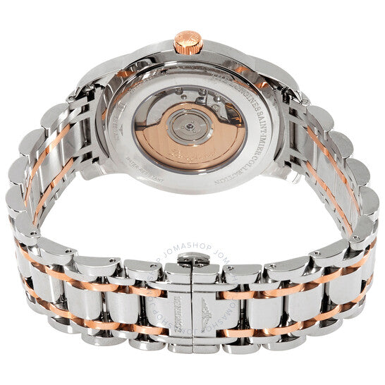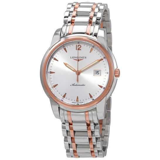 علبة من الفولاذ المقاوم للصدأ مع سوار من الفولاذ المقاوم للصدأ بوصلات من الذهب الوردي عيار 18 قيراطًا. فولاذ مقاوم للصدأ ثابت مع حلقة من الذهب الوردي عيار 18 قيراطًا مرصعة. ميناء فضي مع عقارب مضيئة بلون الذهب الوردي وعلامات ساعات. يظهر رقم عربي عند موضع الساعة 12. علامات دقائق حول الحافة الخارجية. نوع الميناء: تناظري. عقارب وعلامات مضيئة. عرض التاريخ عند موضع الساعة 3. حركة لونجين الأوتوماتيكية عيار L619، مبنية على ETA 2892-A2، تحتوي على 21 جوهرة، تنبض بمعدل 28800 ذبذبة في الساعة، ولديها احتياطي طاقة لمدة 42 ساعة تقريبًا. زجاج ياقوت مقاوم للخدش. تاج قابل للسحب/الدفع. غطاء خلفي شفاف. شكل دائري. حجم العلبة: 41 مم. سمك العلبة: 10.5 مم. عرض السوار: 20 مم. مشبك قابل للطي. مقاومة للماء حتى عمق 30 مترًا / 100 قدم. الوظائف: التاريخ، الساعة، الدقيقة، الثانية. سلسلة سانت إيمييه. تصميم ساعة فاخر. علامة الساعة: صناعة سويسرية. ساعة لونجين سانت إيمييه الأوتوماتيكية للرجال، بمينا فضي، L2.766.5.72.7.