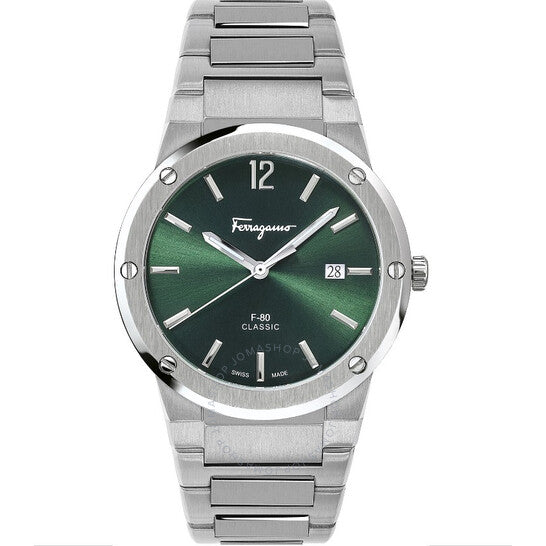 علبة وسوار من الفولاذ المقاوم للصدأ فضي اللون. إطار ثابت من الفولاذ المقاوم للصدأ فضي اللون. ميناء أخضر بعقارب فضية اللون وأرقام عربية مؤشرة عند موضع الساعة ١٢. نوع الميناء: تناظري. عرض التاريخ عند موضع الساعة ٣. آلية حركة كوارتز. زجاج ياقوتي مقاوم للخدش. تاج قابل للسحب/الدفع. غطاء خلفي صلب. شكل العلبة دائري، مقاسها: ٤١ مم. عرض السوار: ٢٦ مم. مشبك قابل للطي بزر ضغط. مقاومة للماء حتى عمق ٥٠ مترًا / ١٦٥ قدمًا. الوظائف: التاريخ، الساعة، الدقيقة، الثانية. طراز الساعة الرياضية. علامة الساعة: صناعة سويسرية. ساعة سلفاتوري فيراغامو كوارتز للرجال بمينا أخضر SFDT01220.