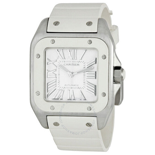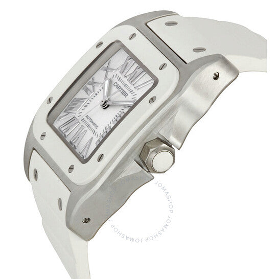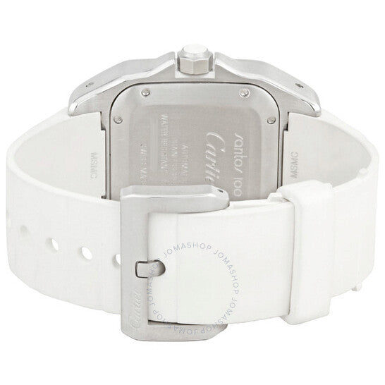 علبة من الفولاذ المقاوم للصدأ مع سوار مطاطي أبيض. إطار ثابت من الفولاذ المقاوم للصدأ. ميناء فضي بعقارب على شكل سيف وعلامات ساعات بأرقام رومانية. علامات دقائق حول حلقة داخلية. عقارب مضيئة. حركة أوتوماتيكية ذاتية التعبئة. زجاج من الياقوت المقاوم للخدش. تاج مثمن مرصع بقطعة مطاطية بيضاء. غطاء خلفي من الفولاذ المقاوم للصدأ. قطر العلبة: 32 مم. سمكها: 11 مم. مشبك تانغ. مقاومة للماء حتى عمق 100 متر / 330 قدمًا. الوظائف: الساعات، الدقائق، الثواني. ساعة كارتييه سانتوس 100 متوسطة نسائية W20122U2.