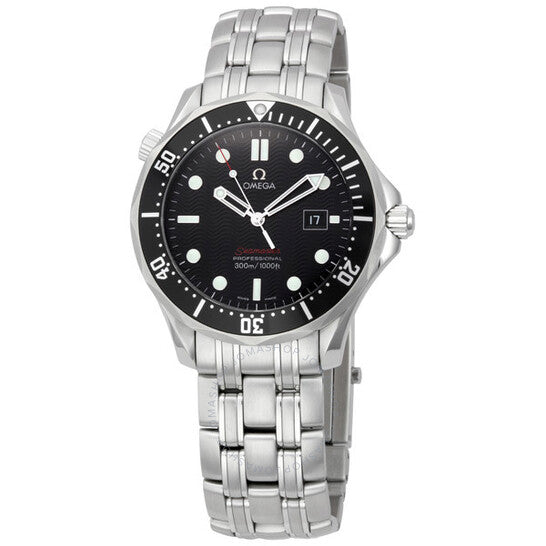 علبة من الفولاذ المقاوم للصدأ مع سوار من الفولاذ المقاوم للصدأ. إطار أسود أحادي الاتجاه مطلي بالأيونات. ميناء أسود بعقارب مضيئة وعلامات ساعات منقطة. علامات دقائق حول الحافة الخارجية. عقارب وعلامات ميناء مضيئة. يعرض التاريخ عند موضع الساعة 3. آلية حركة كوارتز سويسرية. زجاج ياقوت مقاوم للخدش ومضاد للانعكاس. تاج لولبي. غطاء خلفي لولبي. قطر العلبة: 41 مم. سُمكها: 11.8 مم. مشبك قابل للطي. مقاومة للماء حتى عمق 300 متر (1000 قدم). الوظائف: الساعات، الدقائق، الثواني، التقويم. معلومات إضافية: تغيير سهل للمنطقة الزمنية / صمام تفريغ هيليوم / مؤشر نهاية عمر البطارية. ساعة أوميغا سيماستر 300M للرجال 212.30.41.61.01.001.
