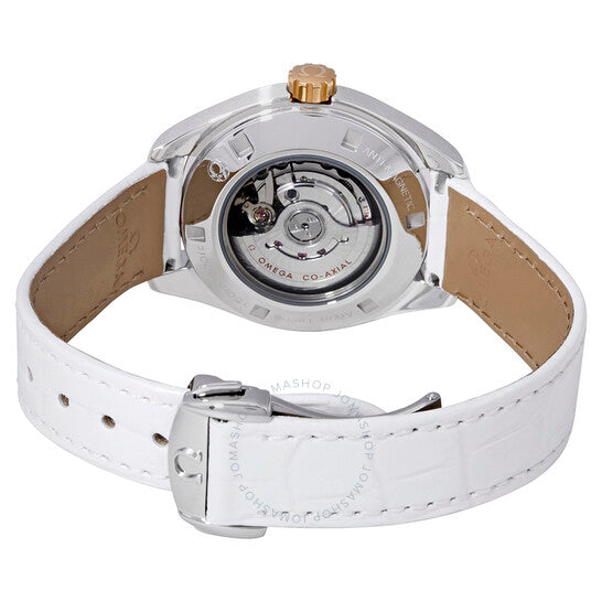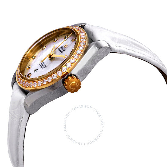 علبة من الفولاذ المقاوم للصدأ مع سوار من جلد التمساح الأبيض. إطار ثابت من الذهب الأصفر عيار 18 قيراطًا مرصع بـ 42 ماسة. ميناء من عرق اللؤلؤ مع عقارب ذهبية مضيئة وعلامات ساعات من الماس. نوع الميناء: تناظري. عقارب مضيئة. عرض التاريخ عند موضع الساعة السادسة. حركة أوتوماتيكية من أوميغا كاليبر 8520، مستوحاة من أوميغا 8500، تحتوي على 28 جوهرة، تنبض بمعدل 25200 ذبذبة في الساعة، ولديها احتياطي طاقة يصل إلى حوالي 50 ساعة. زجاج من الياقوت المقاوم للخدش. تاج لولبي. غطاء خلفي صلب. شكل دائري. حجم العلبة: 34 مم. سمكها: 12.5 مم. عرض السوار: 16 مم. مشبك قابل للطي بزر ضغط. مقاومة للماء حتى عمق 150 مترًا / 500 قدم. الوظائف: التاريخ، الساعات، الدقائق، الثواني، ميزان محوري، كرونومتر. سلسلة سيماستر أكوا تيرا. تصميم فاخر للساعات. علامة الساعة: صناعة سويسرية. ساعة أوميغا سيماستر أكوا تيرا أوتوماتيكية مرصعة بالألماس للسيدات 231.28.34.20.55.004.