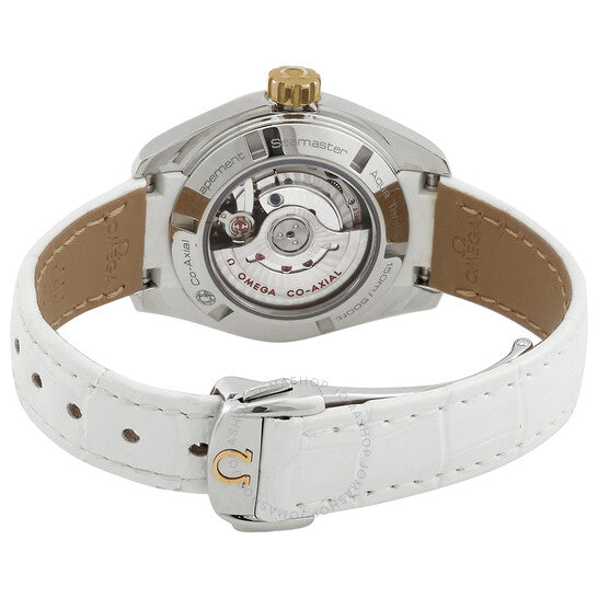 علبة من الفولاذ المقاوم للصدأ مع سوار جلدي أبيض. إطار ثابت من الذهب الأصفر عيار 18 قيراطًا مرصع بالألماس. ميناء أبيض من عرق اللؤلؤ مع عقارب ذهبية اللون وعلامات ساعات من الألماس. علامات دقائق حول الحافة الخارجية. نوع الميناء: تناظري. عقارب مضيئة. عرض التاريخ عند موضع الساعة 3. حركة أوتوماتيكية من أوميغا كاليبر 8520 مع احتياطي طاقة يصل إلى 50 ساعة. زجاج ياقوت مقاوم للخدش. غطاء خلفي شفاف. حجم العلبة: 30 مم. شكلها دائري. عرض السوار: 14 مم. مقاومة للماء حتى عمق 150 مترًا / 500 قدم. الوظائف: التاريخ، الساعات، الدقائق، الثواني، ميزان محوري، كرونومتر. تصميم ساعة فاخرة. علامة الساعة: صناعة سويسرية. ساعة أوميغا سيماستر أكوا تيرا أوتوماتيكية نسائية 231.28.30.20.55.002.