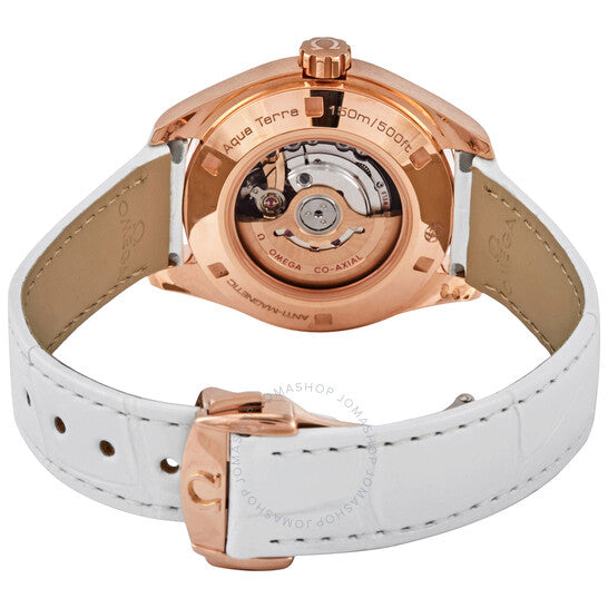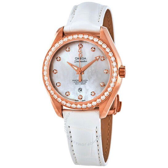 علبة من ذهب سيدنا عيار ١٨ قيراطًا مع سوار جلدي أبيض. إطار ثابت من الذهب الوردي عيار ١٨ قيراطًا مرصع بالألماس. ميناء من عرق اللؤلؤ الأبيض مع عقارب ذهبية اللون وعلامات ساعات من الألماس. نوع الميناء: تناظري. عقارب مضيئة. عرض التاريخ عند موضع الساعة السادسة. حركة أوميجا كاليبر ٨٥٢١ أوتوماتيكية، مبنية على أوميجا ٨٥٢٠، تحتوي على ٢٨ جوهرة، تنبض بتردد ٢٥٢٠٠ ذبذبة في الساعة، ولديها احتياطي طاقة يقارب ٥٠ ساعة. زجاج من الياقوت المقاوم للخدش. تاج لولبي. غطاء خلفي شفاف. شكل دائري. حجم العلبة: ٣٤ مم. عرض السوار: ١٦ مم. مشبك قابل للطي بزر ضغط. مقاومة للماء حتى عمق ١٥٠ مترًا / ٥٠٠ قدم. الوظائف: التاريخ، الساعات، الدقائق، الثواني، ميزان محوري، كرونومتر. طراز ساعة فاخرة. علامة الساعة: سويسرية الصنع. ساعة أوميغا سيماستر أكوا تيرا دايموند للسيدات 231.58.34.20.55.003.
