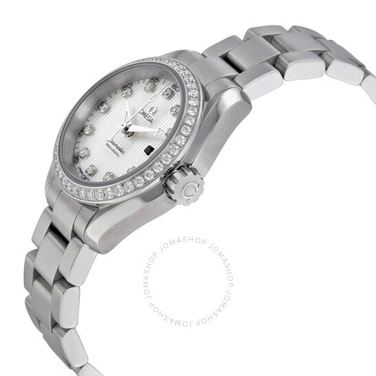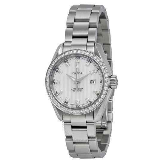 علبة من الفولاذ المقاوم للصدأ مع سوار من الفولاذ المقاوم للصدأ. إطار ثابت فضي اللون مرصع بالألماس. ميناء فضي بعقارب مضيئة و11 علامة ساعات مرصعة بالألماس. يعرض التاريخ عند موضع الساعة 3. آلية حركة كوارتز. زجاج ياقوت مقاوم للخدش. تاج لولبي. غطاء خلفي لولبي. قطر العلبة: 30 مم. مشبك قابل للطي. مقاومة للماء حتى عمق 150 مترًا/500 قدم. الوظائف: الساعات/الدقائق/الثواني/التاريخ.