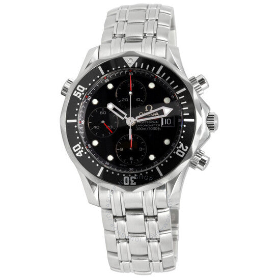 علبة من الفولاذ المقاوم للصدأ مع سوار من الفولاذ المقاوم للصدأ. إطار أسود أحادي الاتجاه مطلي بالأيونات. ميناء أسود بعقارب مضيئة وعلامات ساعات منقطة. علامات دقائق حول الحافة الخارجية. عقارب وعلامات مضيئة. يعرض التاريخ عند موضع الساعة 3. كرونوغراف - ثلاثة أقراص فرعية تعرض: 60 ثانية، 30 دقيقة، و12 ساعة. حركة كرونومتر أوتوماتيكية. زجاج ياقوت مقاوم للخدش. تاج لولبي. غطاء خلفي لولبي. صمام تفريغ هيليوم. قطر العلبة: 41.5 مم. سمكها: 16.8 مم. مشبك قابل للطي. مقاومة للماء حتى عمق 300 متر / 1000 قدم. الوظائف: الساعات/الدقائق/الثواني/التاريخ/الكرونوغراف. ساعة أوميغا سيماستر الرجالية 300 متر 213.30.42.40.01.001.