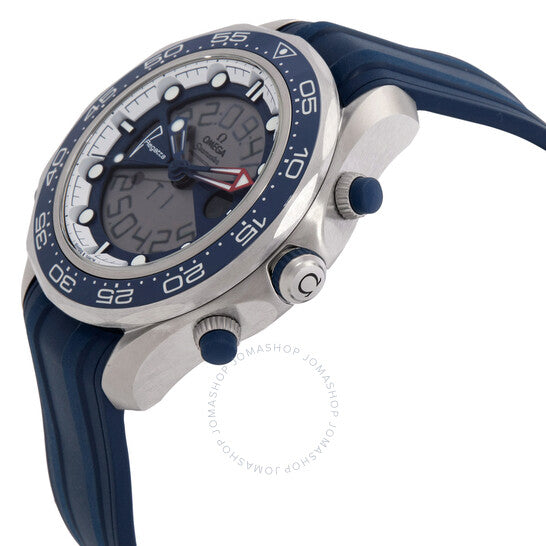علبة من التيتانيوم مع سوار مطاطي أزرق. إطار من السيراميك الأزرق. ميناء رمادي مع عقارب زرقاء وحمراء ومؤشرات ساعات. مؤشرات دقائق حول الحافة الخارجية. نوع الميناء: تناظري-رقمي. عقارب ومؤشرات مضيئة. حركة كوارتز أوميغا كاليبر 5701. زجاج ياقوتي مقاوم للخدش. غطاء خلفي صلب. شكل العلبة دائري، مقاسها: 46.75 مم، سمكها: 15.6 مم. عرض السوار: 20 مم. مشبك قابل للطي. مقاومة للماء حتى عمق 50 مترًا / 165 قدمًا. الوظائف: كرونوغراف، ساعات، دقائق، ثوانٍ، تقويم دائم، منبه. سلسلة سيماستر ريغاتا. طراز الساعة الرياضية. ساعة أوميغا سيماستر ريغاتا كرونوغراف كوارتز تناظرية-رقمية للرجال 21692467910001.