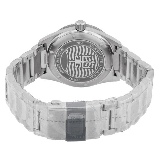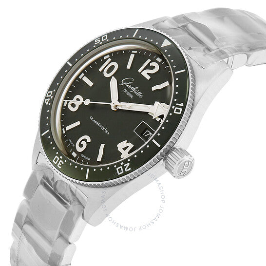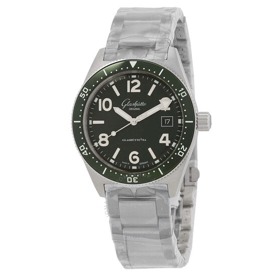 علبة من الفولاذ المقاوم للصدأ مع سوار من الفولاذ المقاوم للصدأ. إطار دوار أحادي الاتجاه من الفولاذ المقاوم للصدأ مع حلقة سيراميك خضراء مرصعة. ميناء أخضر بعقارب فضية مضيئة وأرقام عربية متناوبة وعلامات ساعات. علامات دقائق حول الحافة الخارجية. نوع الميناء: تناظري. عقارب وعلامات مضيئة. عرض التاريخ عند موضع الساعة 3. حركة أوتوماتيكية أصلية من غلاشوت، كاليبر 39-11، تحتوي على 25 جوهرة، تنبض بمعدل 28800 ذبذبة في الساعة، ولديها احتياطي طاقة لمدة 40 ساعة تقريبًا. زجاج من الياقوت المقاوم للخدش. تاج لولبي. غطاء خلفي صلب. شكل دائري. حجم العلبة: 39.5 مم. سمك العلبة: 12.15 مم. عرض السوار: 20 مم. مشبك قابل للطي. مقاومة للماء حتى عمق 200 متر / 660 قدمًا. الوظائف: التاريخ، الساعة، الدقائق، الثواني. معلومات إضافية: العلبة الأصلية، بطاقة الضمان الدولية، دليل الاستخدام (ملحقات كاملة). سلسلة سيك. ساعة فاخرة. علامة الساعة: صُنعت في ألمانيا. ساعة غلاشوت سي كيو أوريجينال أوتوماتيكية للرجال، بمينا أخضر، 1-39-11-13-83-70.