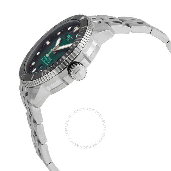 علبة وسوار من الفولاذ المقاوم للصدأ فضي اللون. إطار دوار أحادي الاتجاه من السيراميك الأسود. ميناء أخضر متدرج اللون مع عقارب مضيئة فضية اللون وعلامات ساعات منقطة. علامات دقائق حول الحافة الخارجية. نوع الميناء: تناظري. عقارب وعلامات مضيئة. عرض التاريخ فوق موضع الساعة السادسة. حركة أوتوماتيكية Powermatic 80.111، تحتوي على 23 جوهرة، تنبض بمعدل 28800 ذبذبة في الساعة، ولديها احتياطي طاقة يصل إلى 80 ساعة تقريبًا. زجاج من الياقوت المقاوم للخدش. تاج لولبي. غطاء خلفي شفاف. شكل العلبة دائري، مقاس العلبة: 43 مم، سمكها: 12.7 مم. عرض السوار: 21 مم. مشبك قابل للطي مع مفتاح أمان. مقاومة للماء حتى عمق 300 متر / 1000 قدم. الوظائف: التاريخ، الساعة، الدقائق، الثواني. سلسلة سيستار. طراز ساعة الغوص. ملصق الساعة: صناعة سويسرية. ساعة تيسوت سيستار أوتوماتيكية للرجال T120.407.11.091.01.
