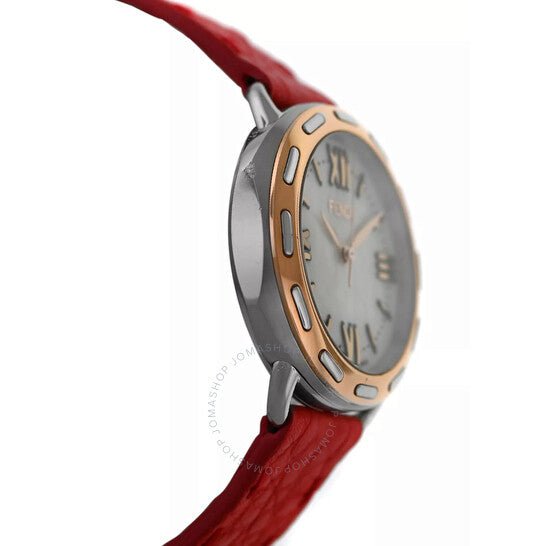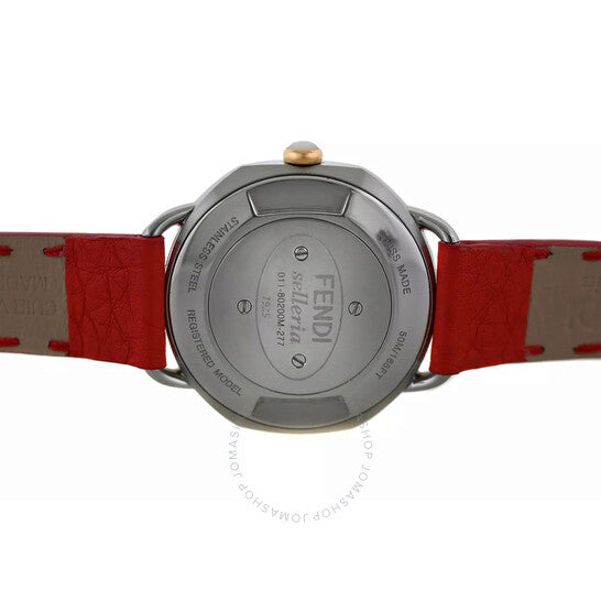 علبة فضية اللون من الفولاذ المقاوم للصدأ مع سوار جلدي أحمر. إطار ثابت من الفولاذ المقاوم للصدأ بلون ذهبي وردي. ميناء أبيض بعقارب بلون ذهبي وردي وأرقام رومانية وعلامات ساعات. علامات دقائق حول الحافة الخارجية. نوع الميناء: تناظري. حركة كوارتز. غطاء خلفي صلب. شكل دائري، مقاس العلبة: 36 مم. مشبك بإبزيم. مقاومة للماء حتى عمق 50 مترًا / 165 قدمًا. الوظائف: الساعات، الدقائق، الثواني. سلسلة سيليريا. تصميم ساعة فاخرة. علامة الساعة: صناعة سويسرية. ساعة فندي سيليريا كوارتز نسائية بمينا بيضاء F8302345H0.