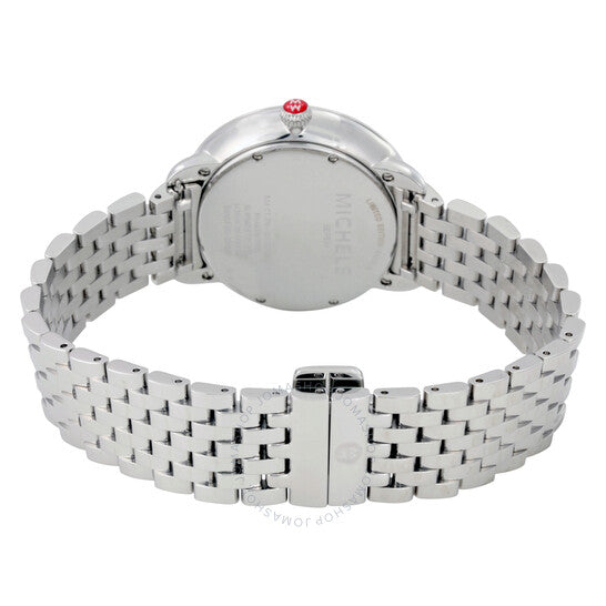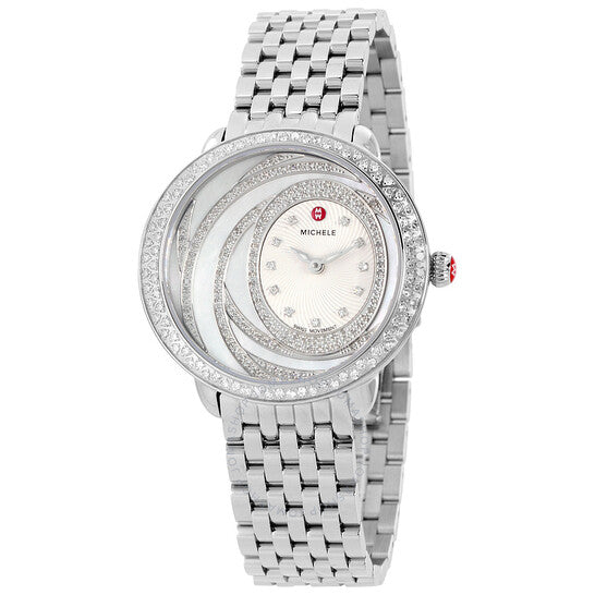 علبة من الفولاذ المقاوم للصدأ مع سوار من الفولاذ المقاوم للصدأ. إطار ثابت من الفولاذ المقاوم للصدأ مرصع بالألماس. ميناء من عرق اللؤلؤ بتصميم دائري متشابك مع عقارب فضية اللون وعلامات ساعات من الألماس. نوع الميناء: تناظري. حركة كوارتز. زجاج من الياقوت المقاوم للخدش. تاج أحمر من الكابوشون. غطاء خلفي صلب. أبعاد العلبة: 34 مم × 36 مم. شكل العلبة بيضاوي. عرض السوار: 16 مم. مشبك قابل للطي. مقاومة للماء حتى عمق 50 مترًا / 165 قدمًا. الوظائف: الساعات، الدقائق، الثواني. معلومات إضافية: يمكن تبديل السوار مع أي سوار ميشيل مقاس 16 مم. طراز ساعة رسمية. ساعة ميشيل سيرين النسائية 16 إكستريم دايموند MWW21F000001.