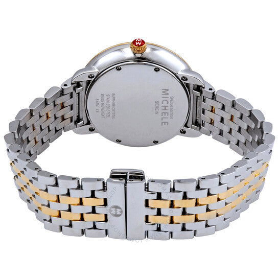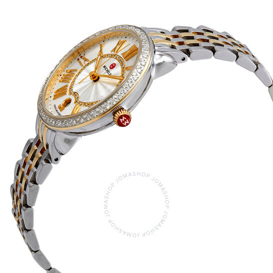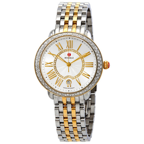 علبة من الفولاذ المقاوم للصدأ بسوار من الفولاذ المقاوم للصدأ ثنائي اللون (فضي وذهبي عيار ١٨ قيراطًا). إطار ثابت من الفولاذ المقاوم للصدأ مرصع بالألماس. ميناء فضي أبيض مزين بنقشة أشعة الشمس (مرصع بالألماس) مع عقارب مضيئة من الذهب الأصفر وعلامات ساعات بأرقام رومانية. علامات دقائق حول الحافة الخارجية. نوع الميناء: تناظري. عقارب مضيئة. عرض التاريخ عند موضع الساعة ٦. حركة كوارتز. زجاج ياقوت مقاوم للخدش. تاج قابل للسحب/الدفع. غطاء خلفي صلب. شكل دائري. حجم العلبة: ٣٦ مم. عرض السوار: ١٦ مم. مشبك قابل للطي. مقاومة للماء حتى عمق ٥٠ مترًا / ١٦٥ قدمًا. الوظائف: التاريخ، الساعة، الدقيقة، الثانية. معلومات إضافية: ساعة مرصعة بـ ١٣٤ ماسة (٠.٦١ قيراطًا). سلسلة سيرين. طراز ساعة رياضية. علامة الساعة: صناعة سويسرية. ساعة ميشيل سيرين النسائية من الفولاذ ومطلية بالذهب عيار ١٨ قيراطًا، MWW21B000138.