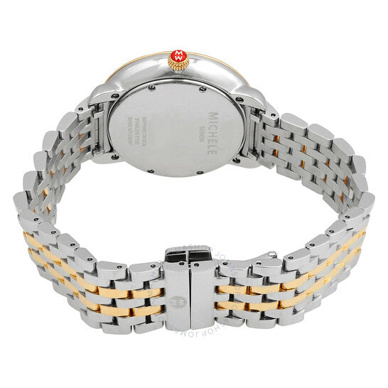 علبة من الفولاذ المقاوم للصدأ مع سوار من الفولاذ المقاوم للصدأ بوصلات من الذهب الأصفر عيار 18 قيراطًا. إطار ثابت من الذهب الأصفر عيار 18 قيراطًا. ميناء فضي-أبيض مزين بنقشة أشعة الشمس (مرصع بالألماس) مع عقارب مضيئة من الذهب الأصفر وعلامات ساعات بأرقام رومانية. علامات دقائق حول الحافة الخارجية. نوع الميناء: تناظري. عقارب مضيئة. حركة كوارتز. زجاج ياقوت مقاوم للخدش. تاج قابل للسحب/الدفع. غطاء خلفي صلب. شكل دائري. حجم الهيكل: 36 مم. عرض السوار: 16 مم. مشبك فراشة. مقاومة للماء حتى عمق 50 مترًا / 165 قدمًا. الوظائف: الساعات، الدقائق، الثواني. معلومات إضافية: ميناء مرصع بـ 46 ماسة (0.1100 قيراط). سلسلة سيرين المتوسطة. تصميم ساعة كاجوال. علامة الساعة: صناعة سويسرية. ساعة ميشيل سيرين متوسطة كوارتز نسائية MWW21B000148.