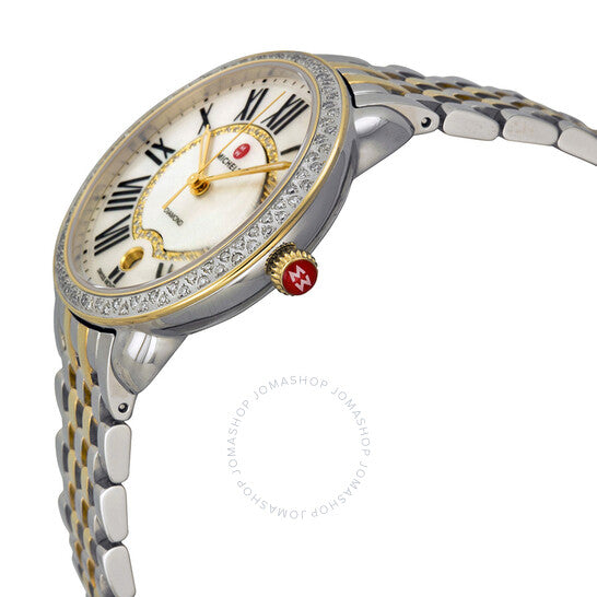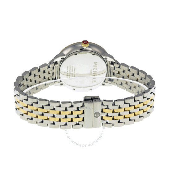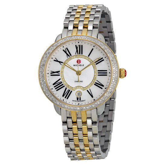علبة من الفولاذ المقاوم للصدأ بسوار من الفولاذ المقاوم للصدأ ثنائي اللون (فضي وذهبي أصفر). إطار ثابت من الذهب الأصفر مرصع بالألماس. ميناء مرصع بالألماس من عرق اللؤلؤ مع عقارب مضيئة من الذهب الأصفر وعلامات ساعات رومانية. علامات دقائق حول الحافة الخارجية. نوع الميناء: تناظري. عرض التاريخ عند موضع الساعة 6. حركة كوارتز. زجاج ياقوت مقاوم للخدش. تاج قابل للسحب/الدفع. غطاء خلفي صلب. أبعاد العلبة: 36 مم × 34 مم. شكل العلبة دائري. عرض السوار: 16 مم. طول السوار: 7.8 بوصة. مشبك قابل للطي بزر ضغط مزدوج. مقاومة للماء حتى عمق 50 مترًا / 165 قدمًا. الوظائف: التاريخ، الساعة، الدقيقة، الثانية. طراز ساعة رسمية. علامة الساعة: صناعة سويسرية. ساعة ميشيل سيرين النسائية ثنائية اللون من عرق اللؤلؤ MWW21B000032.
