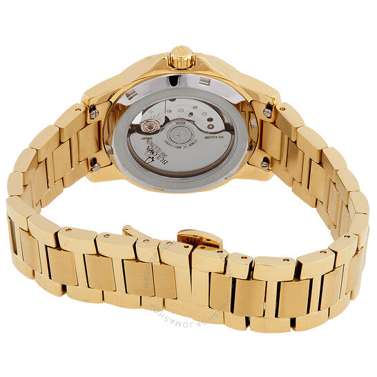 علبة وسوار من الفولاذ المقاوم للصدأ بلون ذهبي. إطار ثابت من الفولاذ المقاوم للصدأ بلون ذهبي. ميناء من عرق اللؤلؤ مع عقارب فضية اللون وعلامات ساعات بأرقام رومانية مرصعة بالألماس. مقياس دقائق حول الحافة الداخلية. نوع الميناء: تناظري. عقارب مضيئة. حركة أوتوماتيكية من بولوفا كاليبر 9029 مع احتياطي طاقة لمدة 42 ساعة. زجاج ياقوت مقاوم للخدش. غطاء خلفي شفاف. شكل العلبة دائري، مقاسها: 35 مم. عرض السوار: 18 مم. مشبك قابل للطي بزر ضغط. مقاومة للماء حتى عمق 100 متر / 330 قدمًا. الوظائف: ساعة، دقيقة. سلسلة A. طراز ساعة رسمية. ساعة بولوفا أوتوماتيكية نسائية من سلسلة A مرصعة بالألماس 97P171.