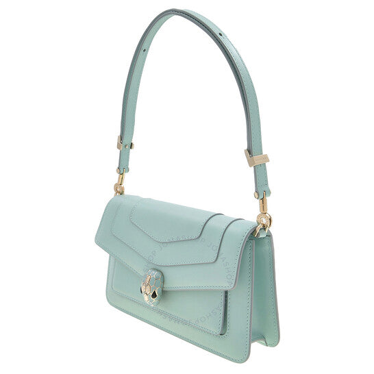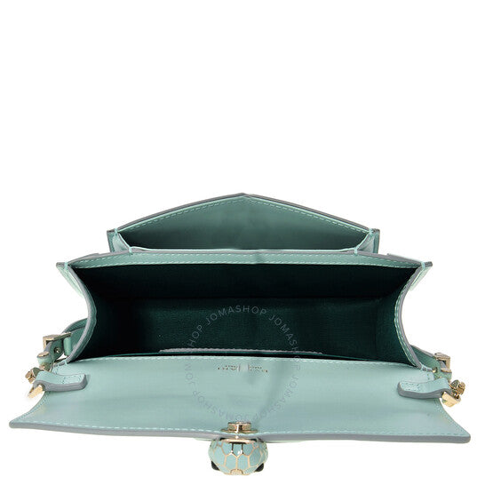 حقيبة كتف بولغري النسائية. سلسلة سيربنتي فوريفر. رمز المنتج: 293634. اللون: أزرق فاتح. المقاس: 8.7 × 5.1 × 0.7 بوصة. حقيبة كتف بولغري سيربنتي فوريفر إيست-ويست الجلدية. مصنوعة من جلد العجل، وتتميز بحزام جلدي عملي، وقفل مغناطيسي على شكل رأس ثعبان مستوحى من مجوهرات سيربنتي من الستينيات. تحتوي على حجرة واحدة، وجيوب أمامية وخلفية، وجيب داخلي بخياطة، وثلاث فتحات للبطاقات، ومرآة قابلة للتخصيص، وشعار بولغري المعدني، وكلها مزينة بأجزاء معدنية من النحاس المطلي بالذهب الفاتح. الخامة: جلد العجل. صنع في إيطاليا.