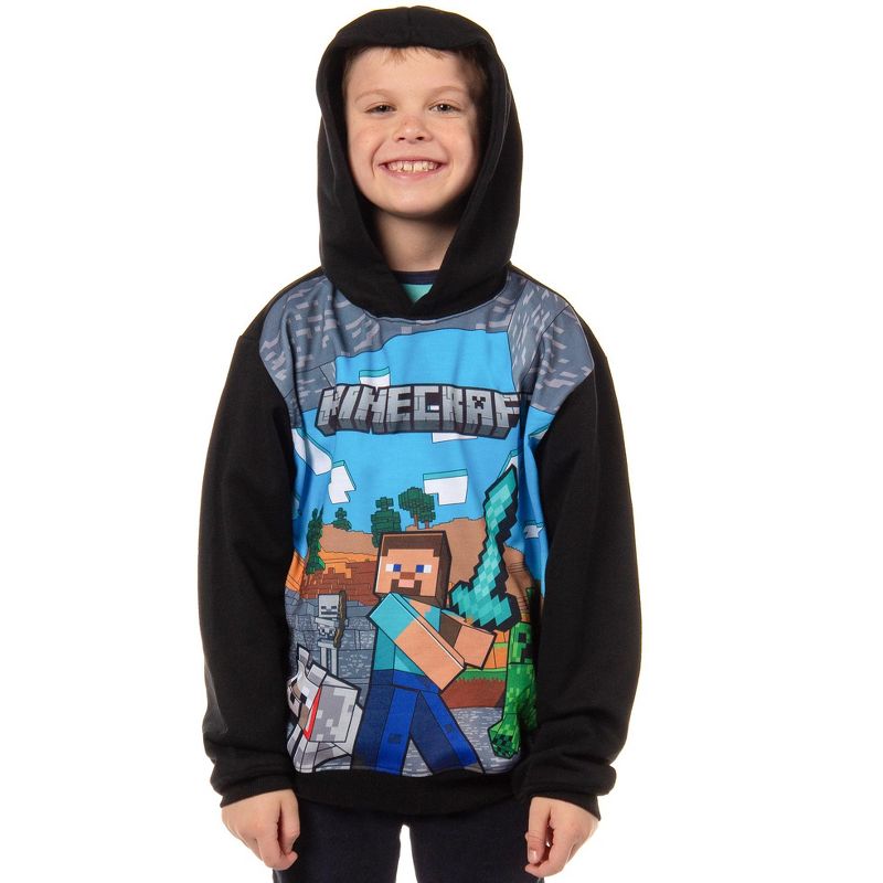 - تصميم ماينكرافت مُجهّز للمغامرات: يتميز هذا الهودي بطبعة حماسية لستيف وهو يحمل سيفًا من الألماس في عالم ماينكرافت، برفقة ذئبٍ وفيّ محاطٍ بالزواحف والهياكل العظمية. ألوانه الزاهية تُضفي حيويةً على هذا المشهد الملحمي.