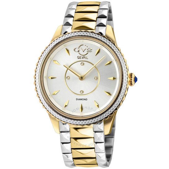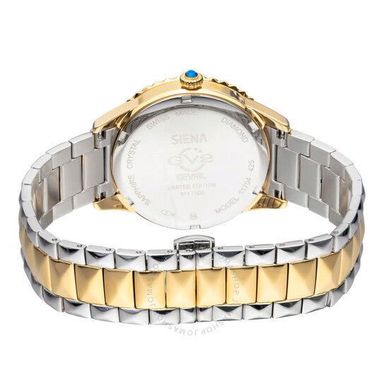 علبة من الفولاذ المقاوم للصدأ بلون ذهبي مع سوار من الفولاذ المقاوم للصدأ بلونين (فضي وذهبي). إطار ذهبي ثابت (مقطع بالألماس). ميناء فضي مع عقارب ومؤشرات ساعات ذهبية اللون. مرصعة بالألماس عند مواضع الساعة 3 و6 و9 و12. نوع الميناء: تناظري. حركة كوارتز. زجاج ياقوت مقاوم للخدش. تاج سحب/دفع مرصع بحجر كابوشون أزرق. غطاء خلفي صلب. شكل دائري. حجم العلبة: 38 مم. سمكها: 9 مم. عرض السوار: 18 مم. طول السوار: 7 بوصات. مشبك قابل للطي بزر ضغط. مقاومة للماء حتى عمق 3 أمتار / 10 أقدام. الوظائف: الساعات والدقائق. سلسلة سيينا. ساعة أنيقة. GV2 من جيفريل سيينا كوارتز نسائية بمينا فضي مرصعة بالألماس، 11704-425.