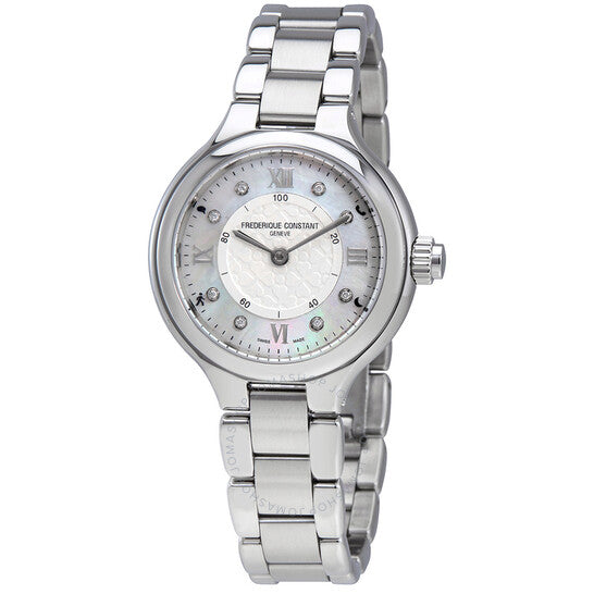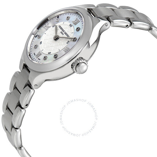 علبة من الفولاذ المقاوم للصدأ مع سوار من الفولاذ المقاوم للصدأ. إطار ثابت من الفولاذ المقاوم للصدأ. ميناء فضي بعقارب فضية اللون وعلامات ساعات من الألماس. أرقام رومانية تُشير إلى الساعات 3 و6 و9 و12. علامات دقائق حول الحافة الخارجية. نوع الميناء: تناظري. حركة كوارتز من عيار فريدريك كونستانت MMT-281. زجاج ياقوت مقاوم للخدش. غطاء خلفي صلب. شكل دائري. حجم العلبة: 34 مم. سُمكها: 11.04 مم. مشبك قابل للطي. مقاومة للماء حتى عمق 30 مترًا / 100 قدم. الوظائف: الساعات، الدقائق، مُتتبّع النشاط، تنبيهات النشاط، مُدرّب ديناميكي، مُراقبة النوم، منبه ذكي، مُؤقت عالمي، إشعارات، تخزين سحابي. طراز ساعة رسمية. علامة الساعة: صناعة سويسرية. ساعة فريدريك كونستانت الذكية النسائية بمينا فضي، FC-281WHD3ER6B.
