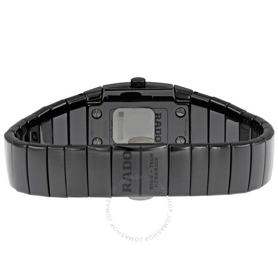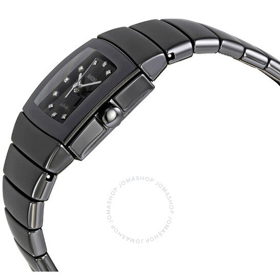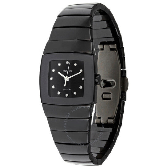 علبة من السيراميك الأسود مع سوار من السيراميك الأسود. إطار ثابت من السيراميك الأسود. ميناء أسود بعقارب فضية اللون وعلامات ساعات من الألماس. يظهر اسم رادو عند موضع الساعة ١٢. نوع الميناء: تناظري. حركة كوارتز سويسرية. كريستال ياقوت مقاوم للخدش. غطاء خلفي صلب ببرغي. قطر العلبة: ٢٢ مم. سُمكها: ٨ مم. مشبك قابل للطي بزر ضغط. مقاومة للماء حتى عمق ٣٠ مترًا / ١٠٠ قدم. وظائفها: الساعات، الدقائق، الثواني. تصميم كاجوال. ساعة رادو سينترا جوبيلي النسائية مرصعة بـ ١٢ ألماسة، R13726752.