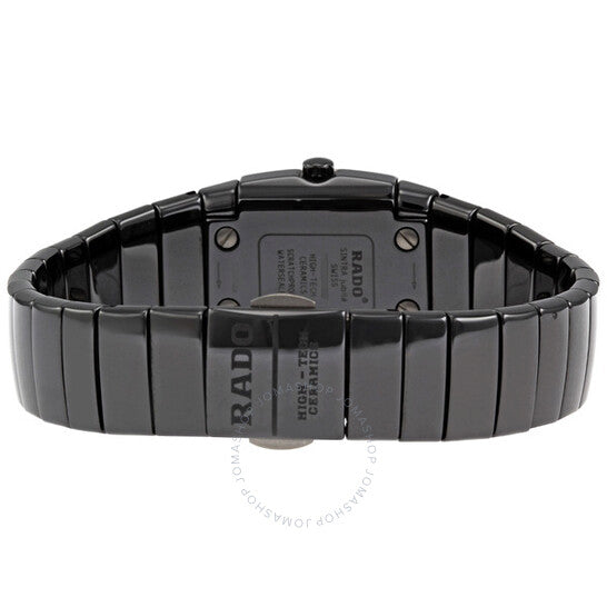 علبة من السيراميك الأسود مع سوار من السيراميك الأسود. إطار ثابت من السيراميك الأسود مرصع بـ 40 ماسة. ميناء أسود بعقارب فضية اللون وعلامات ماسية عند موضعي ربع الساعة. يظهر اسم رادو أسفل موضع الساعة 12. آلية حركة كوارتز. زجاج من الياقوت المقاوم للخدش. غطاء خلفي صلب. أبعاد العلبة: 21 مم × 18 مم. سُمك العلبة: 7.2 مم. مقاومة للماء حتى عمق 30 مترًا / 100 قدم. الوظائف: ساعة، دقيقة. ساعة رادو سينترا جوبيلي نسائية R13618712.