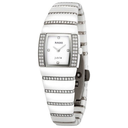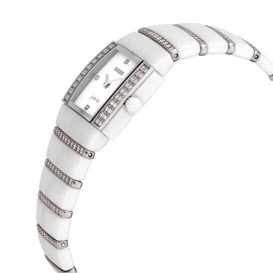 علبة من السيراميك الأبيض والذهب الأبيض عيار 18 قيراطًا، مع سوار من السيراميك الأبيض والذهب الأبيض عيار 18 قيراطًا مرصع بالألماس. إطار أبيض ثابت مرصع بـ 40 ماسة. ميناء أبيض مرصع بـ 4 ماسات، وعقارب فضية اللون وعلامات ساعات من الألماس. نوع الميناء: تناظري. حركة كوارتز. زجاج ياقوت مقاوم للخدش. تاج قابل للسحب/الدفع. غطاء خلفي صلب. شكل العلبة مستطيل، مقاسها: 21 مم × 17 مم. مشبك قابل للطي مخفي. مقاومة للماء حتى عمق 30 مترًا / 100 قدم. الوظائف: الساعات، الدقائق. سلسلة سينترا. تصميم ساعة فاخرة. علامة الساعة: صناعة سويسرية. إصدارات المنتج: DO R13633709، DO.R13633709، DOR13633709. ساعة رادو سينترا سوبر جوبيلي الماسية النسائية R13633709.