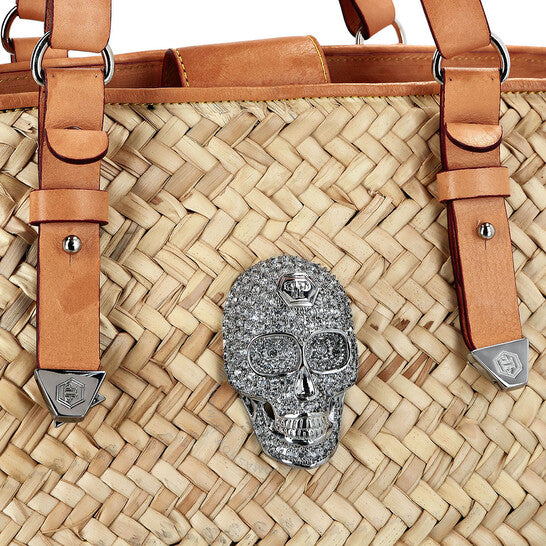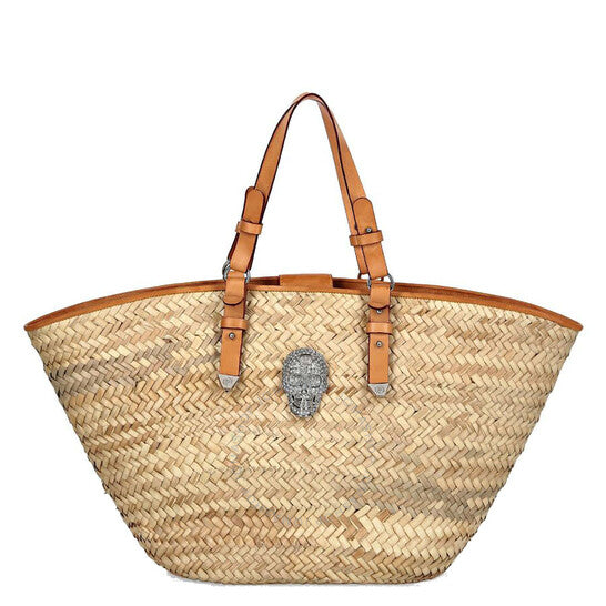 حقيبة توت نسائية من فيليب بلين. رمز المنتج: PAAA-WBA1381-PTE120N-06. نقدم لكم حقيبة سلة الرافية بتفاصيل جلدية، قطعة أنيقة وعصرية تناسب جميع المناسبات. تتميز هذه الحقيبة بمقابض حمل مزدوجة مزينة بإبزيم مرصع بالكريستال، مما يضفي عليها لمسة من الفخامة. تتميز بتصميم جمجمة مرصع بالجواهر بشكل بارز على الواجهة الأمامية، مما يُبرز أسلوب العلامة التجارية المميز. الجزء الداخلي مبطن بقماش مزين بنقاط متنوعة، يجمع بين العملية والتصميم المرح. بأبعاد 30 × 26 × 18 سم، توفر هذه الحقيبة مساحة واسعة مع لمسة أنيقة جريئة. الغلاف الخارجي: 100% قش؛ الغلاف الخارجي رقم 2: 100% جلد عجل؛ البطانة: 100% بوليستر؛ الحشو: 50% بولي يوريثان و50% بولي أميد. صُنعت في إيطاليا.
