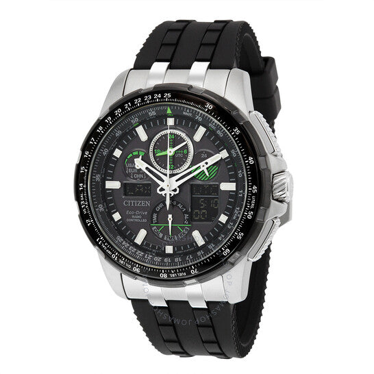 علبة من الفولاذ المقاوم للصدأ مع سوار أسود من البولي يوريثان. ميناء أسود بعقارب فضية اللون وعلامات ساعات. علامات دقائق حول الحافة الخارجية. نوع الميناء: تناظري-رقمي. عقارب وعلامات مضيئة. مؤشر شحن رباعي، وقت مزدوج، 24 ساعة، موانئ فرعية وظيفية. حركة كوارتز. زجاج معدني مقاوم للخدش. تاج لولبي. غطاء خلفي صلب. حجم العلبة: 47 مم. شكل دائري. مشبك تانغ. مقاومة للماء حتى عمق 200 متر / 660 قدم. الوظائف: الساعات، الدقائق، الثواني، الكرونوغراف، مؤقت تنازلي، مؤقت عالمي، منبهات، مؤشر شحن البطارية، تقويم دائم. طراز ساعة رياضية. علامة الساعة: Japan Movt. ساعة سيتيزن سكاي هوك AT كرونوغراف بيربتشوال للرجال JY8051-08E.