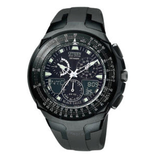 ساعة سيتيزن سكاي هوك زاخرة بالتقنيات. مثالية للاستخدام اليومي والسفر المتكرر. تشمل الميزات الرئيسية الوقت والتقويم في 22 منطقة زمنية (30 مدينة)، واحتياطي طاقة مذهل لمدة 4 سنوات، و3 منبهات للتوقيت العالمي. لم يكن تعدد المهام بهذه السهولة والأناقة من قبل. سوار أسود من البولي يوريثان. ميناء أسود. احتياطي طاقة لمدة 4 سنوات. الوقت والتقويم في 22 منطقة زمنية (30 مدينة). ثلاثة منبهات للتوقيت العالمي. كرونوغراف بدقة 1/100 ثانية يقيس حتى 24 ساعة. مؤقت تنازلي لمدة 99 دقيقة. أوقات تناظرية/رقمية قابلة للتبديل بلمسة واحدة. إطار دوار بمسطرة منزلقة. علبة خلفية ملولبة. كريستال غير عاكس. مشبك قابل للطي بزر ضغط. تنبيه لإعادة ضبط الوقت. وظيفة توفير الطاقة. نافذة مؤشر انخفاض الشحن. مقاومة للماء حتى عمق 100 متر (330 قدمًا). ساعة سيتيزن سكاي هوك بلاك إيجل للرجال JR3155-03E
