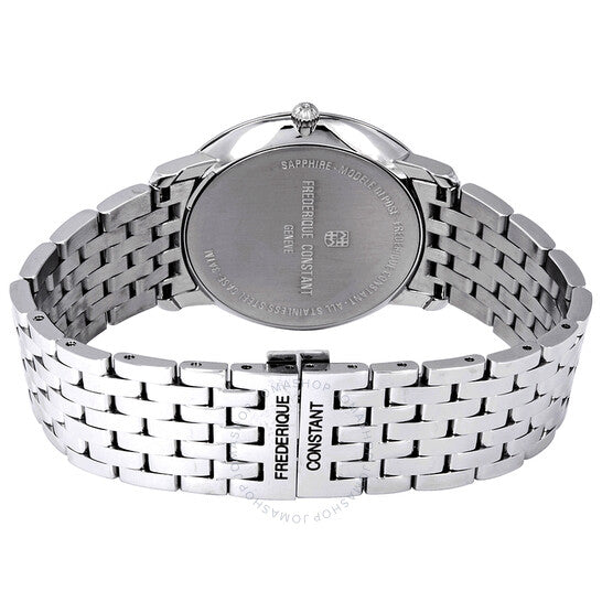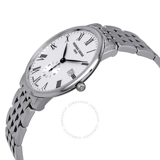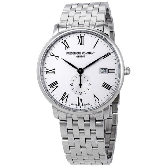 علبة من الفولاذ المقاوم للصدأ مع سوار من الفولاذ المقاوم للصدأ. إطار ثابت من الفولاذ المقاوم للصدأ. ميناء أبيض بعقارب سوداء وعلامات ساعات رومانية. علامات دقائق حول الحافة الخارجية. نوع الميناء: تناظري. عرض التاريخ عند موضع الساعة 3. ميناء فرعي 60 ثانية. حركة كوارتز من عيار فريدريك كونستانت FC-245. زجاج ياقوت مقاوم للخدش. تاج قابل للسحب/الدفع. غطاء خلفي صلب. شكل دائري. حجم العلبة: 39 مم. سمكها: 5 مم. عرض السوار: 18 مم. مشبك قابل للطي. مقاومة للماء حتى عمق 30 مترًا / 100 قدم. الوظائف: التاريخ، الساعة، الدقائق، الثواني. تصميم كاجوال. علامة الساعة: صناعة سويسرية. ساعة فريدريك كونستانت سليم لاين للرجال بمينا أبيض FC-245WR5S6B.