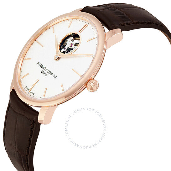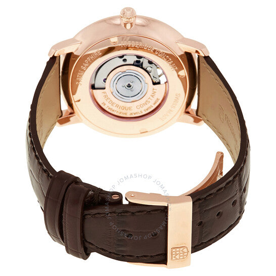 علبة من الفولاذ المقاوم للصدأ مطلية بالذهب الوردي مع سوار من جلد العجل البني. إطار ثابت من الفولاذ المقاوم للصدأ مطلي بالذهب الوردي. ميناء فضي (قلب مفتوح) بعقارب فضية اللون على شكل ورقة شجر وعلامات ساعات. علامات دقائق حول الحافة الخارجية. نوع الميناء: تناظري. حركة أوتوماتيكية من عيار فريدريك كونستانت FC-312، تحتوي على 25 جوهرة، تنبض بمعدل 28800 ذبذبة في الساعة، ولديها احتياطي طاقة لمدة 42 ساعة تقريبًا. زجاج ياقوت مقاوم للخدش. تاج قابل للسحب/الدفع. غطاء خلفي شفاف. شكل دائري، حجم العلبة: 40 مم، سمك العلبة: 8.3 مم. عرض السوار: 20 مم. مشبك قابل للطي. مقاومة للماء حتى عمق 30 مترًا / 100 قدم. الوظائف: الساعة، الدقائق. معلومات إضافية: بشكل عام، تتحمل رذاذ الماء أو الغمر لفترة وجيزة في الماء، ولكنها غير مناسبة للسباحة أو الاستحمام. سلسلة Slimline. تصميم ساعة فاخرة. ملصق الساعة: صناعة سويسرية. ساعة فريدريك كونستانت سليملاين أوتوماتيكية بقرص فضي للرجال 312V4S4.