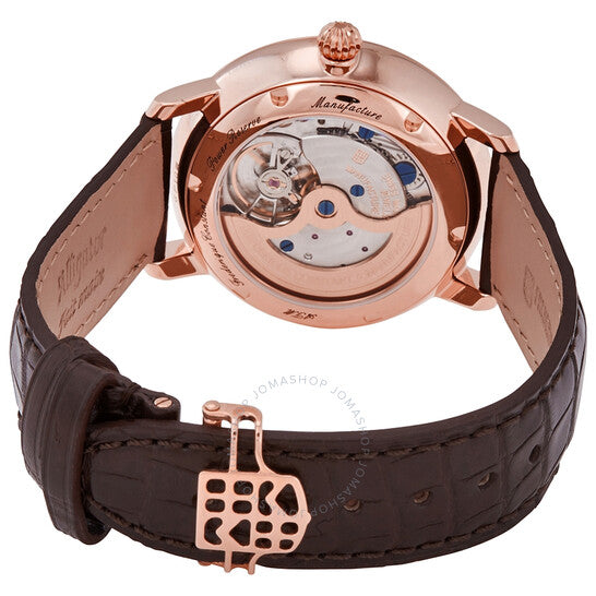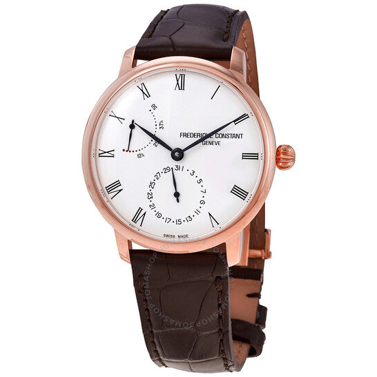 علبة من الفولاذ المقاوم للصدأ بلون الذهب الوردي مع حزام من جلد التمساح البني الداكن. إطار ثابت بلون الذهب الوردي. ميناء فضي بعقارب سوداء على شكل ورقة شجر وعلامات ساعات بأرقام رومانية. نوع الميناء: تناظري. شاشتان لعرض التاريخ ومؤشر احتياطي الطاقة. حركة أوتوماتيكية من عيار فريدريك كونستانت FC-723، تحتوي على 28 جوهرة، تنبض بتردد 28800 ذبذبة في الساعة، وتحتفظ باحتياطي طاقة يدوم لحوالي 50 ساعة. زجاج من الياقوت المقاوم للخدش. تاج قابل للسحب/الدفع. غطاء خلفي شفاف. شكل دائري. حجم العلبة: 40 مم. سمكها: 11 مم. عرض السوار: 20 مم. مشبك قابل للطي. مقاومة للماء حتى عمق 30 مترًا / 100 قدم. الوظائف: التاريخ، الساعات، الدقائق، مؤشر احتياطي الطاقة. تصميم كاجوال. علامة الساعة: صناعة سويسرية. ساعة فريدريك كونستانت سليملاين أوتوماتيكية للرجال بمينا فضي، FC-723WR3S4.