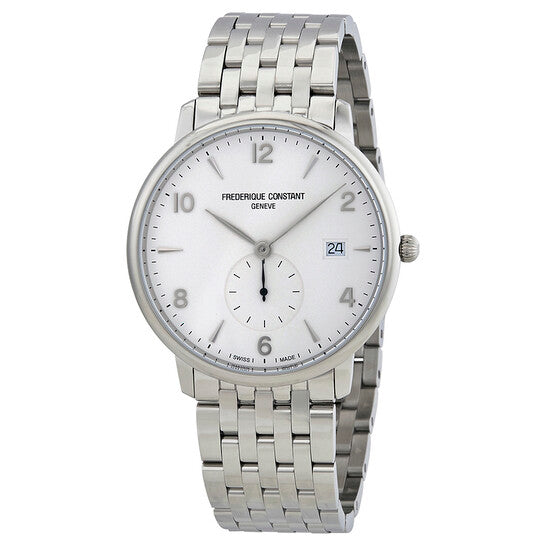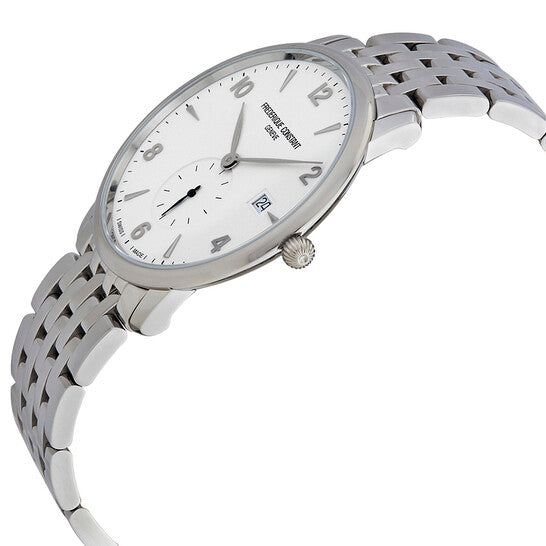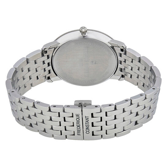 علبة من الفولاذ المقاوم للصدأ مع سوار من الفولاذ المقاوم للصدأ. إطار ثابت. ميناء أبيض بعقارب فضية اللون ومؤشرات ساعات بأرقام عربية. نوع الميناء: تناظري. عرض التاريخ عند موضع الساعة الثالثة. حركة كوارتز. زجاج ياقوتي مقاوم للخدش. حجم العلبة: 38 مم. سُمكها: 5 مم. شكلها دائري. مقاومة للماء حتى عمق 30 مترًا / 100 قدم. الوظائف: التاريخ، الساعة، الدقائق، الثواني. تصميم ساعة فاخر. علامة الساعة: صناعة سويسرية. ساعة فريدريك كونستانت سليملاين للرجال 245SA5S6B.