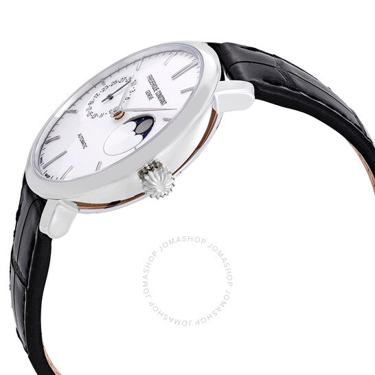 علبة من الفولاذ المقاوم للصدأ مع سوار أسود من جلد التمساح. إطار ثابت من الفولاذ المقاوم للصدأ. ميناء فضي اللون بعقارب وعلامات ساعات فضية اللون. علامات دقائق حول الحافة الخارجية. نوع الميناء: تناظري. نافذة عرض التاريخ عند موضع الساعة التاسعة. ميناءان فرعيان يعرضان التاريخ وطور القمر. حركة أوتوماتيكية من عيار فريدريك كونستانت FC-702، تحتوي على 26 جوهرة، تنبض بتردد 28800 ذبذبة في الساعة، وتتمتع باحتياطي طاقة يدوم حوالي 42 ساعة. زجاج من الياقوت المقاوم للخدش. تاج قابل للسحب/الدفع. غطاء خلفي شفاف. شكل دائري. حجم العلبة: 38.8 مم. سمكها: 11.3 مم. عرض السوار: 20 مم. مشبك قابل للطي. مقاومة للماء حتى عمق 30 مترًا / 100 قدم. الوظائف: طور القمر، التاريخ، الساعة، الدقائق. سلسلة Slimline Moonphase. تصميم ساعة كاجوال. علامة الساعة: صناعة سويسرية. ساعة فريدريك كونستانت سليملاين مون فيز أوتوماتيكية بمينا فضي للرجال FC-702S3S6.