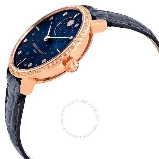علبة من الفولاذ المقاوم للصدأ مطلية بالذهب الوردي مع سوار من جلد التمساح الأزرق اللامع. إطار ثابت مطلي بالذهب الوردي مرصع بالألماس. ميناء كحلي (نجوم) بعقارب فضية اللون على شكل أوراق شجر وعلامات ساعات من الألماس. مؤشرات عند مواضع الساعة 3 و6 و9 و12. نوع الميناء: تناظري. عرض أطوار القمر. حركة أوتوماتيكية من عيار فريدريك كونستانت FC-701 مع احتياطي طاقة لمدة 42 ساعة. كريستال ياقوت محدب مقاوم للخدش. تاج قابل للسحب/الدفع. غطاء خلفي شفاف. شكل دائري. حجم العلبة: 38.8 مم. سمك العلبة: 11 مم. عرض السوار: 19 مم. مشبك قابل للطي. مقاومة للماء حتى عمق 30 مترًا / 100 قدم. الوظائف: الساعات، الدقائق، أطوار القمر. معلومات إضافية: علبة مرصعة بـ 60 ماسة. سلسلة Slimline Moonphase Stars. تصميم ساعة فاخرة. علامة الساعة: صناعة سويسرية. ساعة فريدريك كونستانت سليملاين مون فيز ستارز أوتوماتيكية مرصعة بالألماس للسيدات FC-701NSD3SD4.