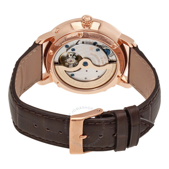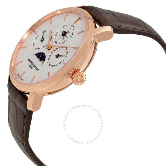 علبة من الفولاذ المقاوم للصدأ بلون الذهب الوردي مع سوار من جلد التمساح البني. إطار ثابت بلون الذهب الوردي. ميناء فضي مع عقارب ومؤشرات ساعات بلون الذهب الوردي. نوع الميناء: تناظري. عرض التاريخ عند موضع الساعة 3. أربعة أقراص فرعية متعددة الوظائف تعرض: الشهر، التاريخ، يوم الأسبوع، الشهر/السنة الكبيسة، وأطوار القمر. حركة أوتوماتيكية من عيار فريدريك كونستانت FC-775، تحتوي على 26 جوهرة، تنبض بتردد 28800 ذبذبة في الساعة، ولديها احتياطي طاقة لمدة 38 ساعة تقريبًا. زجاج ياقوت مقاوم للخدش. غطاء خلفي شفاف. شكل دائري. حجم العلبة: 42 مم. سمك العلبة: 12.5 مم. عرض السوار: 21 مم. مشبك تانغ. مقاومة للماء حتى عمق 30 مترًا / 100 قدم. الوظائف: طور القمر، السنة الكبيسة، الشهر، التاريخ، اليوم، الساعة، الدقيقة. سلسلة Slimline. تصميم ساعة فاخرة. علامة الساعة: سويسرية الصنع. ساعة فريدريك كونستانت سليملاين بيربيتوال أوتوماتيك للرجال 775V4S4.