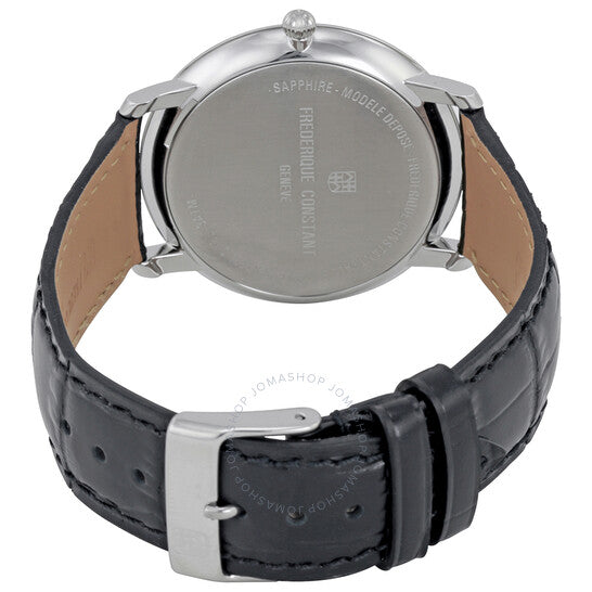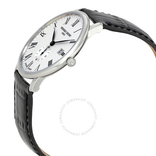 علبة من الفولاذ المقاوم للصدأ مع سوار جلدي أسود. إطار ثابت من الفولاذ المقاوم للصدأ. ميناء أبيض بعقارب سوداء وعلامات ساعات رومانية. نوع الميناء: تناظري. عرض التاريخ عند موضع الساعة 3. ميناء فرعي للثواني الصغيرة فوق موضع الساعة 6. حركة كوارتز من عيار فريدريك كونستانت FC-245. زجاج ياقوت مقاوم للخدش. تاج قابل للدفع والسحب. غطاء خلفي صلب. حجم العلبة: 40 مم. سمكها: 5 مم. شكلها دائري. عرض السوار: 20 مم. مشبك تانغ. مقاومة للماء حتى عمق 30 مترًا / 100 قدم. الوظائف: التاريخ، الساعة، الدقائق، الثواني. طراز ساعة رسمية. علامة الساعة: صناعة سويسرية. ساعة فريدريك كونستانت سليملاين للرجال بمينا أبيض FC-245WR5S6.