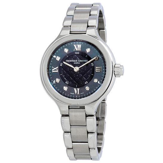 علبة من الفولاذ المقاوم للصدأ مع سوار من الفولاذ المقاوم للصدأ. إطار ثابت من الفولاذ المقاوم للصدأ. ميناء رمادي داكن من عرق اللؤلؤ مع عقارب فضية اللون وعلامات ساعات من الماس. أرقام رومانية تُشير إلى مواقع الساعات 3 و6 و9 و12. علامات دقائق حول الحافة الخارجية. حركة كوارتز من عيار فريدريك كونستانت MMT-281. زجاج ياقوت مقاوم للخدش. تاج قابل للسحب/الدفع. غطاء خلفي صلب. حجم العلبة: 34 مم. سمكها: 11 مم. شكلها دائري. عرض السوار: 15 مم. مشبك قابل للطي. مقاومة للماء حتى عمق 30 مترًا / 100 قدم. الوظائف: الساعات، الدقائق. معلومات إضافية: تتبع النشاط، إشعار المكالمات، مراقبة النوم، وإشعارات الرسائل النصية. تصميم ساعة فاخرة. علامة الساعة: صناعة سويسرية. ساعة فريدريك كونستانت الذكية النسائية، FC-281GHD3ER6B، رمادية من عرق اللؤلؤ.
