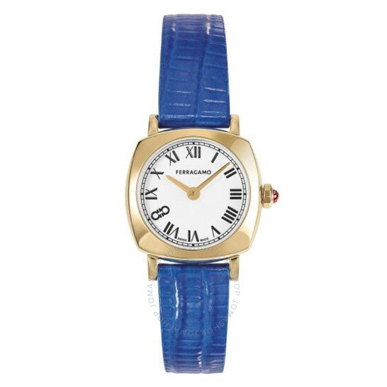 علبة من الفولاذ المقاوم للصدأ بلون ذهبي مع سوار جلدي أزرق. إطار ثابت من الفولاذ المقاوم للصدأ بلون ذهبي. ميناء أبيض بعقارب ذهبية اللون وعلامات ساعات رومانية. حلقتان من الجانشيني عند موضع الساعة 8. علامات دقائق حول الحافة الخارجية. نوع الميناء: تناظري. حركة كوارتز. زجاج ياقوت مقاوم للخدش. تاج قابل للسحب/الدفع. غطاء خلفي صلب. شكل العلبة وسادة، مقاسها: 23 مم. مشبك بإبزيم. مقاومة للماء حتى عمق 30 مترًا / 100 قدم. الوظائف: ساعة، دقيقة. سلسلة سوفت سكوير. تصميم كاجوال. علامة الساعة: صناعة سويسرية. ساعة فيراغامو سوفت سكوير كوارتز نسائية بمينا بيضاء SFKU00223.