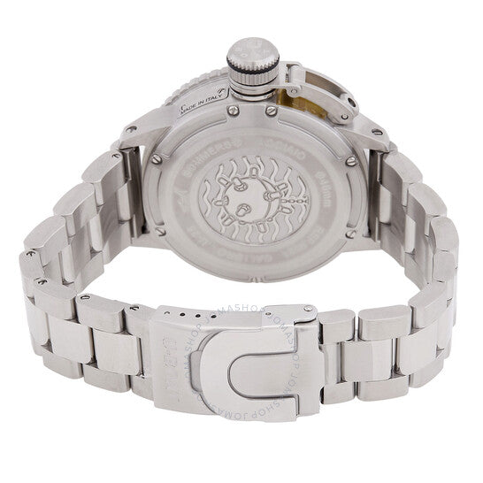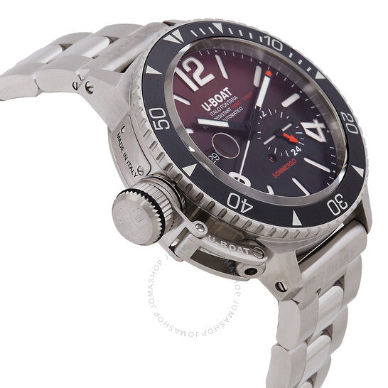 علبة وسوار من الفولاذ المقاوم للصدأ فضي اللون. إطار أسود من الفولاذ المقاوم للصدأ. ميناء أحمر بعقارب سوداء وأرقام عربية وعلامات ساعات. علامات دقائق حول الحافة الخارجية. نوع الميناء: تناظري. عقارب وعلامات مضيئة. عرض التاريخ عند موضع الساعة 9. حركة أوتوماتيكية. كريستال ياقوت مقاوم للخدش. تاج لولبي. غطاء خلفي صلب. شكل العلبة دائري، مقاسها: 46 مم. مشبك قابل للطي مع مفتاح أمان. مقاومة للماء حتى عمق 300 متر / 1000 قدم. الوظائف: التاريخ، الساعة، الدقائق، الثواني. سلسلة سومرسو. طراز ساعة الغوص. ساعة يو بوت سومرسو أوتوماتيكية للرجال بمينا أحمر، موديل 9521/MT.