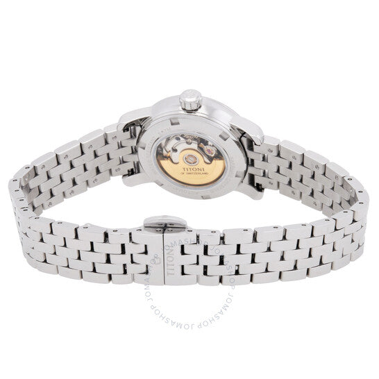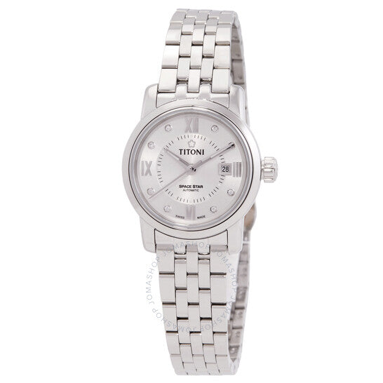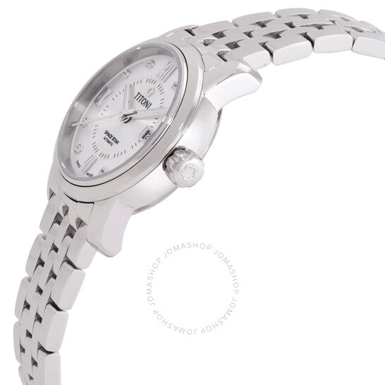 علبة وسوار من الفولاذ المقاوم للصدأ فضي اللون. إطار ثابت من الفولاذ المقاوم للصدأ فضي اللون. ميناء فضي اللون مع عقارب فضية اللون وعلامات ساعات بأرقام رومانية. علامات دقائق حول الحلقة الداخلية. نوع الميناء: تناظري. عرض التاريخ عند موضع الساعة 3. حركة أوتوماتيكية. زجاج ياقوت مقاوم للخدش. تاج قابل للسحب/الدفع. غطاء خلفي شفاف. شكل العلبة دائري، مقاسها 28 مم. مشبك فراشة. مقاومة للماء حتى عمق 50 مترًا / 165 قدمًا. الوظائف: التاريخ، الساعة، الدقائق، الثواني. سلسلة سبيس ستار. تصميم كاجوال. علامة الساعة: صناعة سويسرية. ساعة تيتوني سبيس ستار أوتوماتيكية نسائية بمينا فضي، 23538 S-099.