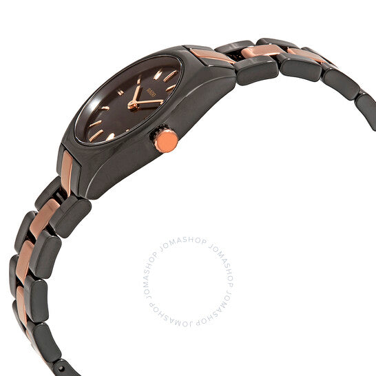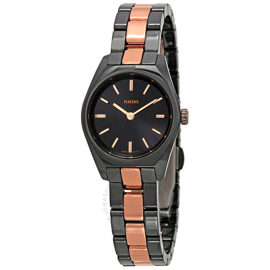 علبة من السيراميك الأسود مع سوار من السيراميك باللونين الأسود والذهبي الوردي. إطار ثابت من السيراميك الأسود. ميناء أسود بعقارب ومؤشرات ساعات باللونين الذهبي الوردي. نوع الميناء: تناظري. حركة كوارتز. زجاج من الياقوت المقاوم للخدش. تاج قابل للسحب/الدفع. غطاء خلفي صلب. شكل دائري، أبعاد العلبة: ٣١ مم × ٢٥ مم، سمكها: ٧ مم. عرض السوار: ١٢ مم، طوله: ٦.٥ بوصة. قابلة للطي مع مشبك بزر ضغط. مقاومة للماء حتى عمق ٣٠ مترًا / ١٠٠ قدم. الوظائف: الساعات، الدقائق. طراز ساعة رسمية. علامة الساعة: صناعة سويسرية. ساعة رادو سبيكيو نسائية بمينا أسود، R31508152.