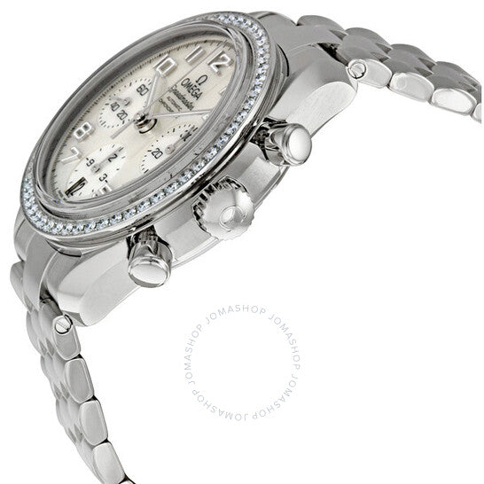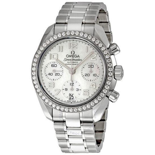 علبة من الفولاذ المقاوم للصدأ فضية اللون مع سوار فضي اللون. إطار ثابت فضي اللون مرصع بالألماس. ميناء من عرق اللؤلؤ مع عقارب فضية اللون مضيئة وعلامات ساعات عربية. علامات دقائق حول الحافة الخارجية. نوع الميناء: تناظري. عقارب وعلامات مضيئة. عرض التاريخ عند موضع الساعة السادسة. كرونوغراف - ثلاثة أقراص فرعية تعرض: 60 ثانية، 30 دقيقة، و12 ساعة. حركة أوميغا كاليبر 3304 أوتوماتيكية، مبنية على ETA 7753، تحتوي على 27 جوهرة، تنبض بمعدل 28800 ذبذبة في الساعة، ولديها احتياطي طاقة لمدة 48 ساعة تقريبًا. كريستال ياقوت مقاوم للخدش. تاج قابل للسحب/الدفع. غطاء خلفي صلب. شكل دائري، حجم العلبة: 38 مم، سمك العلبة: 14.7 مم. عرض السوار: 18 مم. مشبك قابل للطي. مقاومة للماء حتى عمق 100 متر / 330 قدمًا. الوظائف: كرونوغراف، تاريخ، ساعات، دقائق، ثوانٍ، كرونومتر. سلسلة سبيدماستر. طراز ساعة رياضية. علامة الساعة: صناعة سويسرية. إصدارات المنتج: 324 15 38 40 05 001، 324-15-38-40-05-001، 324/15/38/40/05/001، 32415384005001. ساعة أوميغا سبيدماستر أوتوماتيكية كرونوغراف نسائية بإطار ألماس 324.15.38.40.05.001.