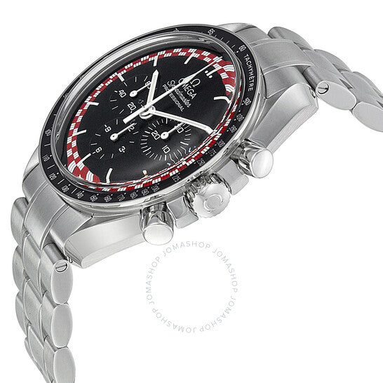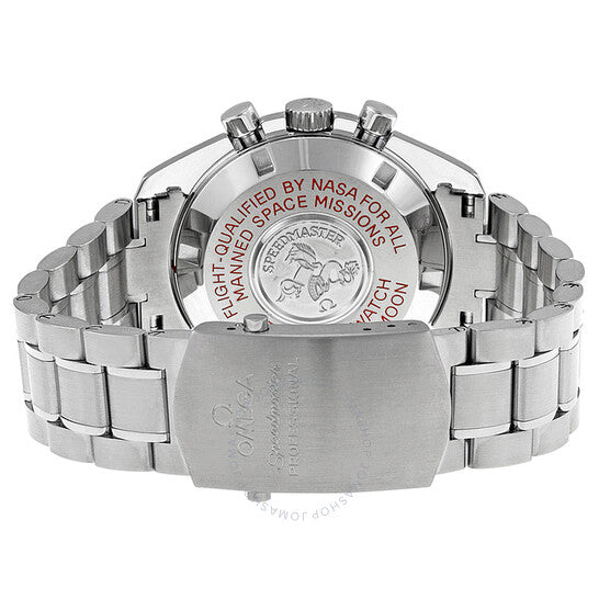 علبة من الفولاذ المقاوم للصدأ مع سوار من الفولاذ المقاوم للصدأ. إطار ألومنيوم أسود ثابت يعرض علامات التاكيميتر. ميناء أسود بعقارب مضيئة وعلامات ساعات. علامات دقائق حول الحافة الخارجية. نوع الميناء: تناظري. عقارب وعلامات مضيئة. كرونوغراف - ثلاثة أقراص فرعية تعرض: ٦٠ ثانية، ٣٠ دقيقة، و١٢ ساعة. حركة يدوية التعبئة مع احتياطي طاقة لمدة ٤٨ ساعة. كريستال هيساليت مقاوم للخدش. تاج قابل للسحب/الدفع. غطاء خلفي صلب. قطر العلبة: ٤٢ مم. شكلها دائري. عرض السوار: ٢٢.٩ مم. طول السوار: ٩ بوصات. مشبك قابل للطي. مقاومة للماء حتى عمق ٥٠ مترًا / ١٦٥ قدمًا. الوظائف: كرونوغراف، تاكيميتر، ساعة، دقيقة، ثانية. طراز ساعة فاخرة. علامة الساعة: صناعة سويسرية. ساعة أوميغا سبيدماستر مون واتش للرجال بمينا أسود من الفولاذ المقاوم للصدأ، رقمها 31130423001004.